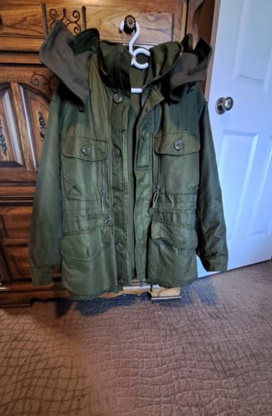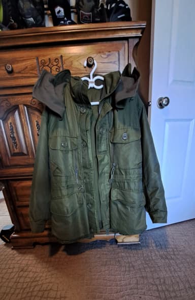 Vintage late 1960s 1970s M65 green combat jacket USMC issue Vietnam era.Original Vintage M 65 combat jacket green in colour, this was USMC issue later 60s early 70s with original silver zipper the military switch in 72 to gold colour metal zippers, the hem and waist ties have been removed by original owner, has USMC stencil still on jacket, all snaps and zippers work, hidden hood in top collar, this is the American made heavy duty jacket has lots of wear left would fit someone 5’9” and weight 165 easily I believe it is a medium to large original tags have been removed, exact measurements so you can see if it will work for you, 20 inches across shoulders, 30 inches long from bottom of collar to hem, 21 1/2 inches waists, 23 inches from shoulder to bottom of cuff arm length, 24 inches hem, has some staining and small snags, no rips or tears, own a piece of history and style with the jacket that is still a fashion statement, southside pick up, no holds with out e transfer and if posted it is available posting in Canada tracked and insured $25.