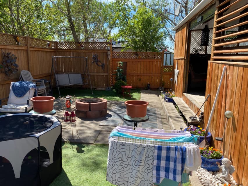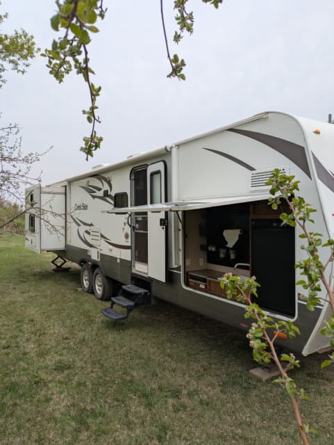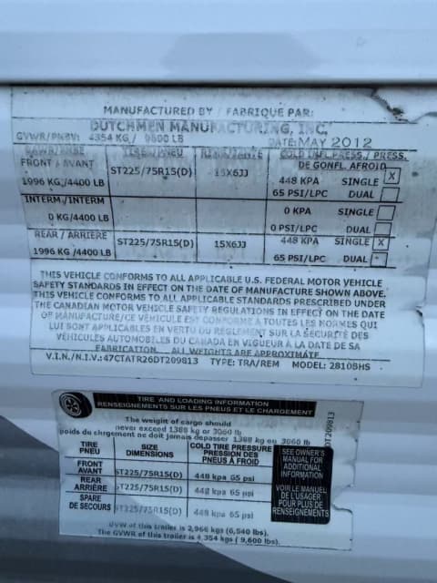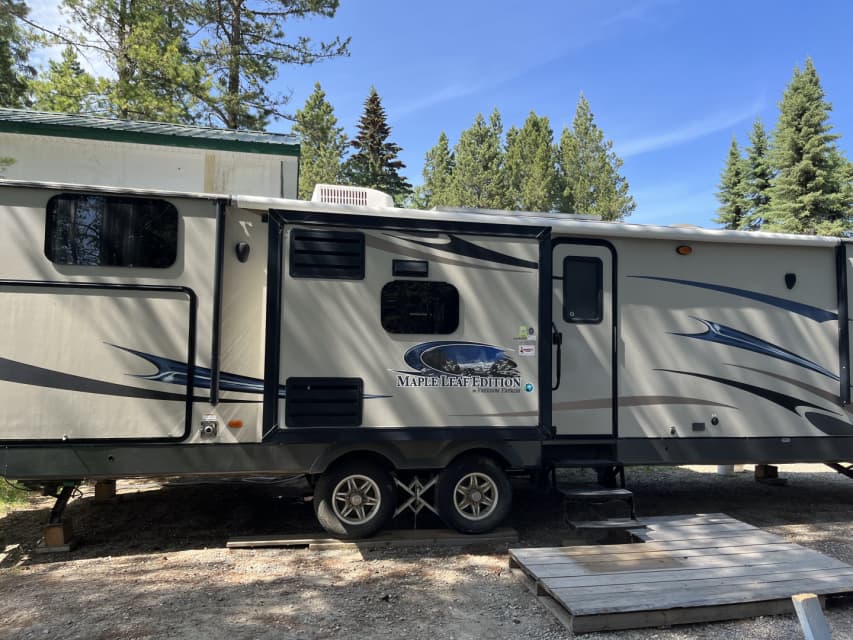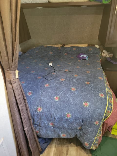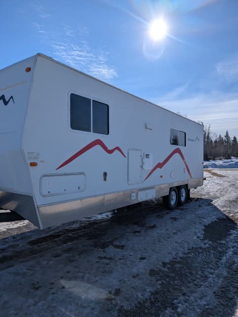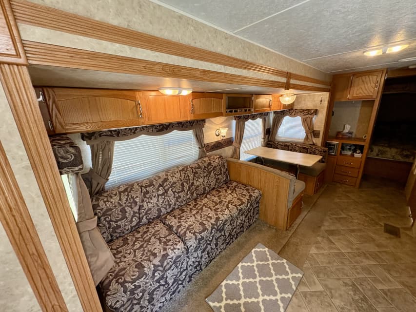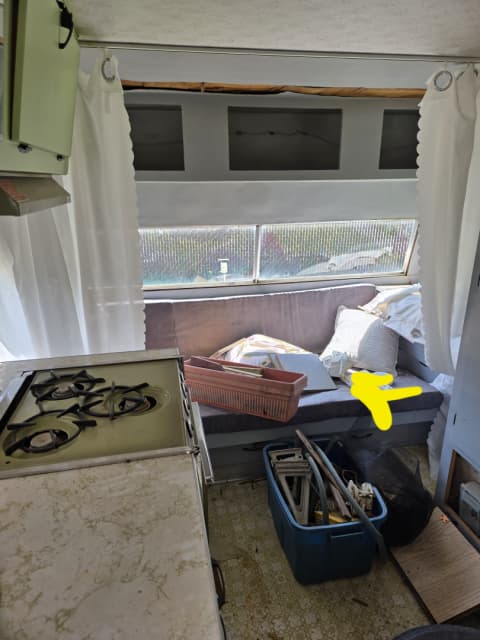 1 bunk bed in back with a single bed over storage drawers and clothes hanger rack (sleeps 3 back there)has accordian door to separate, toilet and shower that all work fine. lots of storage space under seats and tons of room for outdoor stuff in outside storage box at front of trailer. Stereo needs an upgrade to USP/MP3 inputs CD does not work, good sound other wise, antena. Has been resealed where required, lino in back room was cracked up so we took out replaced with rug. 2- 6 volt Batteries in series to make 12 volt, have been removed and charged for winter,good 4 tires with new spare, never went down. Wheel bearings where cleaned and repacked 3 years ago before we bought, 2 50lb propane bottles, outside shower, awning works good, Reason for selling; kids r getting older so we would like to sell or trade for smaller 16-20ft to take across Canada. Happy trails !