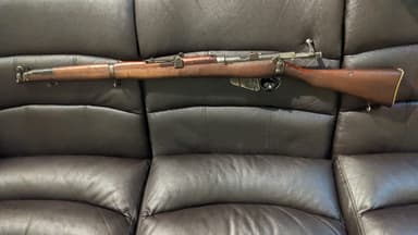 Lee Enfield No: 1 Mark III 1938 GR1 Singapore SMTLE . 303 BRITISH 10 round Mag, full wood, swivels, bayonet lug with pig sticker bayonet included, rear brass butt plate with tool kit compartment, 2000m rear adjustable iron sight. Frame and butt stock medallion match. Mag number unreadable. Length: SMLE No. 1 Mk III: 44.57 in (1,132 mm) Barrel length: SMLE No. 1 Mk III: 25.2 in (640 mm) In late 1915 the Mk III* was introduced incorporating several changes, the most prominent of which were the deletion of the magazine cut-off mechanism, which when engaged permits the feeding and extraction of single cartridges only while keeping the cartridges in the magazine in reserve, and the long-range volley sights. The windage adjustment of the rear sight was also dispensed with, and the cocking piece was changed from a round knob to a serrated slab. Rifles with some or all of these features present are found, as the changes were implemented at different times in different factories and as stocks of parts were depleted. The magazine cut-off was reinstated after the First World War ended, and not entirely dispensed with in manufacturing until 1933. The SMLE Mk III* (renamed Rifle No.1 Mk III* in 1926) saw extensive service throughout the Second World War, especially in the North African, Italian, Pacific and Burmese theatres in the hands of British and Commonwealth forces. Australia and India retained and manufactured the SMLE Mk III* as their standard rifle during the conflict, and the rifle remained in Australian military service through the Korean War, until it was replaced by the L1A1 SLR in the late 1950s.The Lithgow Small Arms Factory finally ceased production of the SMLE Mk III* in 1953.