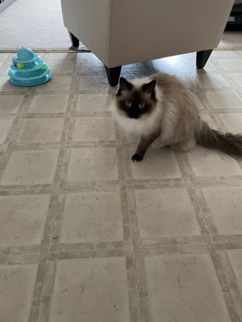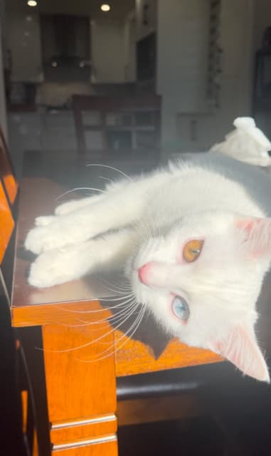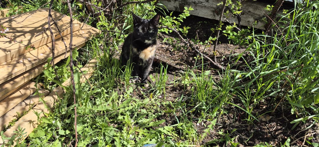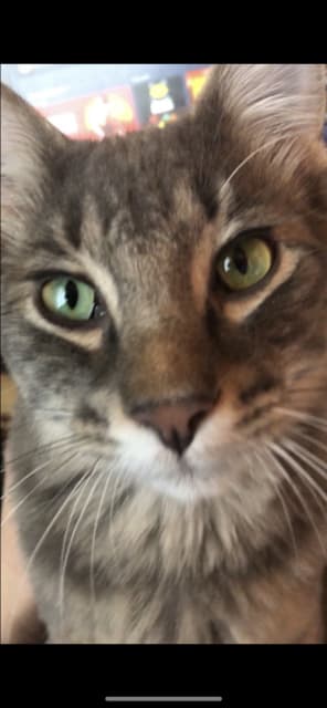 Our stunning tuxedo girl is nearing six months old and growing into a sleek, lean teenager. She’s bigger than the younger kittens—around the size of a small adult cat—curious, affectionate, and very people-oriented.