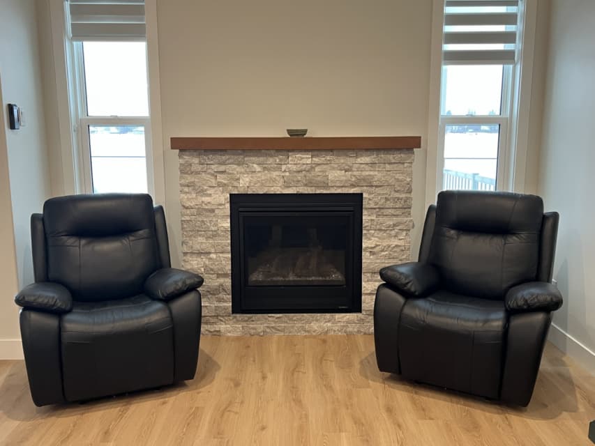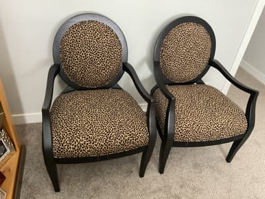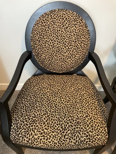The regular chairs have vinyl backs and fabric seats; the captain's chair has fabric back and seat