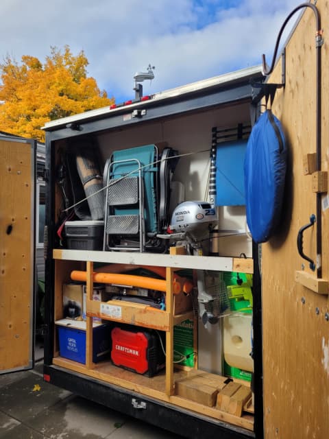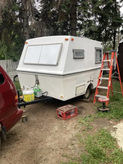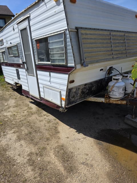 1 bunk bed in back with a single bed over storage drawers and clothes hanger rack (sleeps 3 back there)has accordian door to separate, toilet and shower that all work fine. lots of storage space under seats and tons of room for outdoor stuff in outside storage box at front of trailer. Stereo needs an upgrade to USP/MP3 inputs CD does not work, good sound other wise, antena. Has been resealed where required, lino in back room was cracked up so we took out replaced with rug. 2- 6 volt Batteries in series to make 12 volt, have been removed and charged for winter,good 4 tires with new spare, never went down. Wheel bearings where cleaned and repacked 3 years ago before we bought, 2 50lb propane bottles, outside shower, awning works good, Reason for selling; kids r getting older so we would like to sell or trade for smaller 16-20ft to take across Canada. Happy trails !
