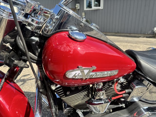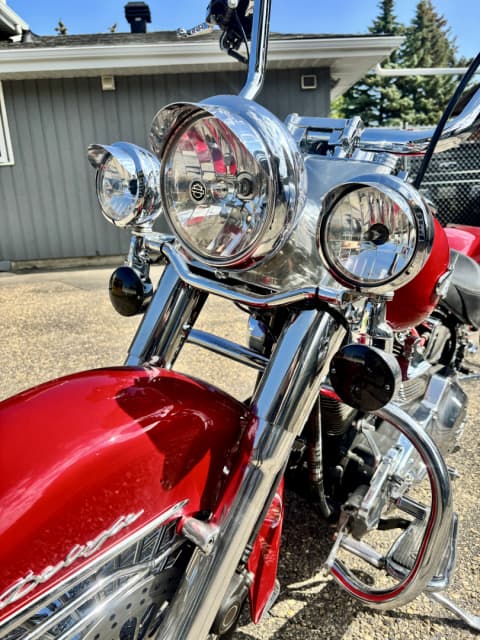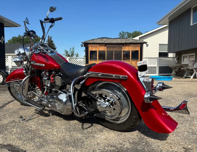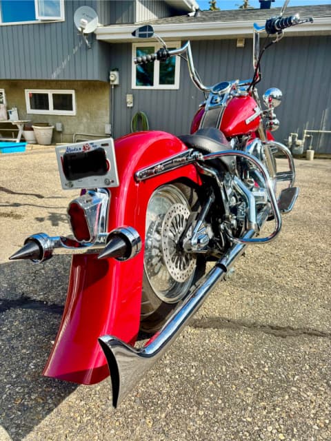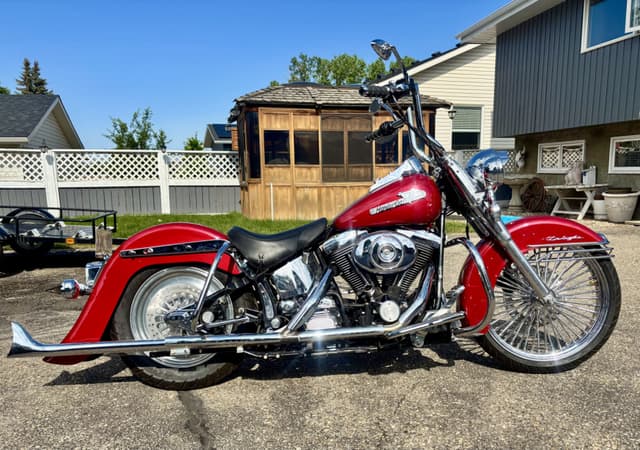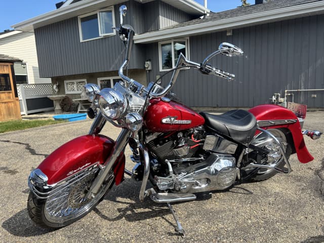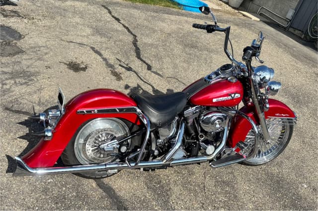 **For Sale: Stunning 1998 Heritage Softail Cholo / Vicla – A True Head-Turner!** Rev up your riding experience with this freshly built 1998 Heritage Softail Cholo, where classic style meets modern performance. With only 3977 kilometers on a completely rebuilt drivetrain, this bike is practically brand new and ready to hit the open road. **Features You'll Love:** - **Eye-Catching Finish:** Drenched in a custom House of Color Laser Red with pearl accents, this bike shines like no other. The unique paint job is complemented by custom front and rear fenders that enhance its sleek silhouette. - **Smooth Ride:** Equipped with Progressive Suspension, the front is upgraded for a plush ride, and the rear is dropped 2 inches for that perfect gangster stance. - **Stunning Wheels:** Featuring a bold 21"x3.5" front Fat Spoke wheel and a sleek 16" rear billet CCI wheel, this bike demands attention from every angle. - **Lighting Upgrades:** Illuminate the night with a new style Harley halogen headlight and passing lamps, ensuring you’re seen wherever your adventures take you. - **Custom Exhaust:** Experience the deep, throaty roar of the Harley Davidson custom one-sided headpipe paired with a Mid US Cycles Fish tail pipe—perfect for those who love a commanding presence on the road. - **Comfort and Control:** Navigate in style with 14" Meat Hook Ape Hangers and custom floorboards that provide both comfort and a unique look. - **Fun Factor:** This beauty isn’t just for show—it’s a blast to cruise on and will turn heads wherever you go! **Asking Price: $10,995** *Serious inquiries only—cash trades only 😎! Don’t miss your chance to own this one-of-a-kind ride that combines vintage charm with modern flair. Contact today to make it yours!*