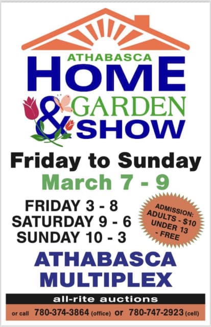 March 7-9th Combination Shows Gun & sportsman show plus A Home & Garden show Athabasca Multiplex Guns & ammo Buy -Sell - Trade Fishing rods, lures ,military supplies, jerky, knives , clothing and so much more Home & Garden show- cleaning supplies, Building supplies, jelly’s , Syrups, art, Food vendors , and so much more ! Admission @ the door Kids 13 & younger are free So bring the family Family rates Starts Friday 3-8pm Saturday 9-6pm Sunday 10-3pm