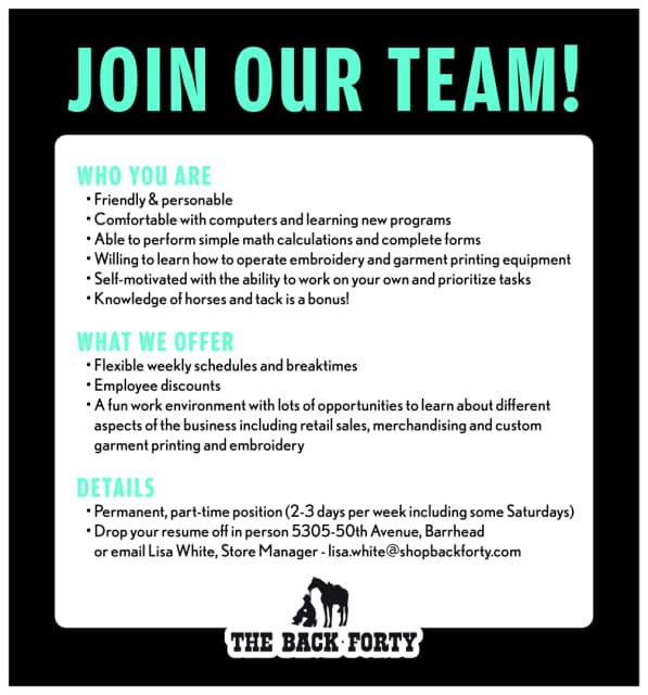 The Back Forty is seeking a retail associate for our busy store in Barrhead, Alberta. The successful candidate will be responsible for assisting customers and completing retail transactions, and will also be trained in operating embroidery and garment printing machines. We sell a variety of items including workwear, western wear, toys, gifts and tack - preference will be given to candidates with equine experience. If you are looking for a long term, part-time position as part of a fun team, this might be the right fit for you! Drop your resume off in person 5305-50th Ave, Barrhead or email Lisa White, Store Manager - lisa.white@shopbackforty.com.
