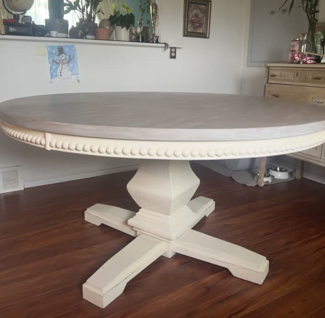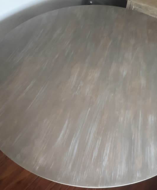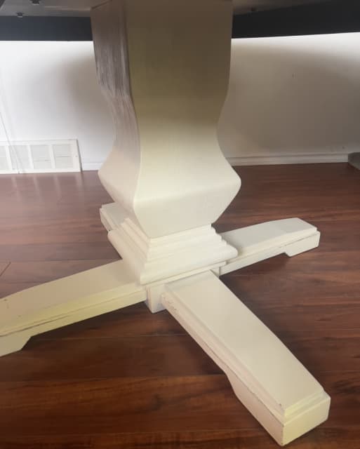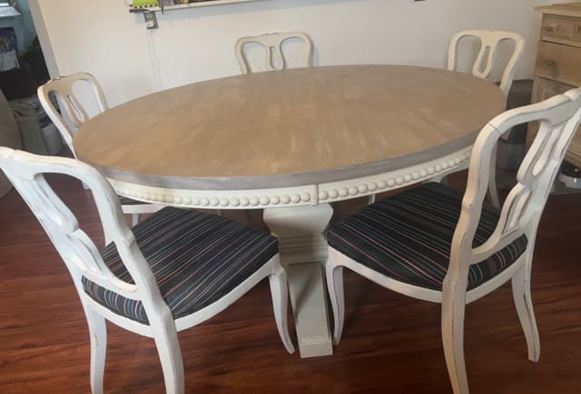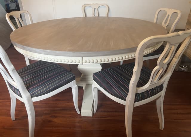 Beautiful dining set!! Top of table newly refinished, Bottom kept as is to keep its character and rustic look. It is 60 inches in diameter. Chairs are newly refinished and re upholstered. The one chair has hand rest, the rest don't. Total of 6 chairs. Pick up in Barrhead. Price is firm.