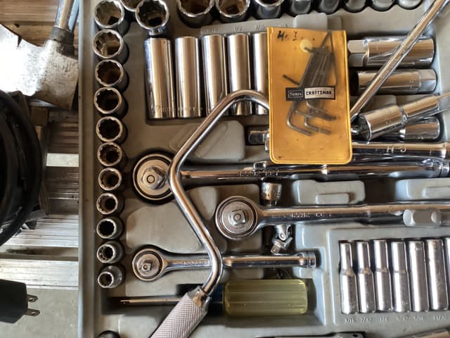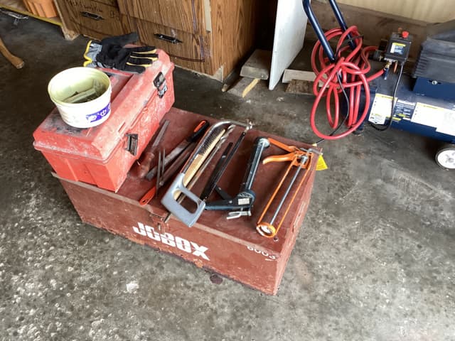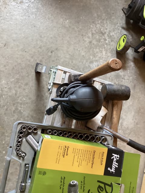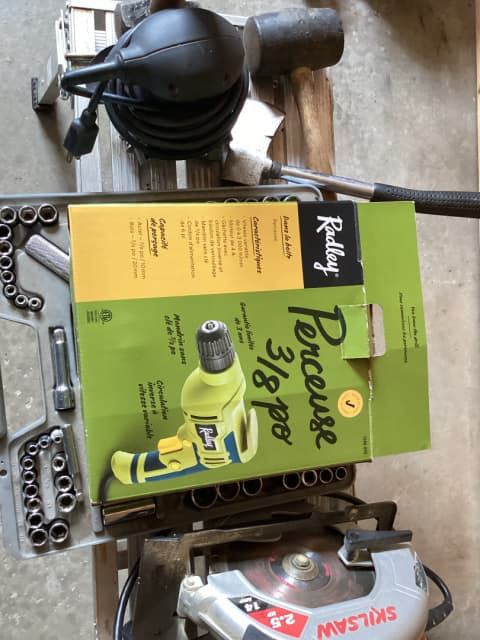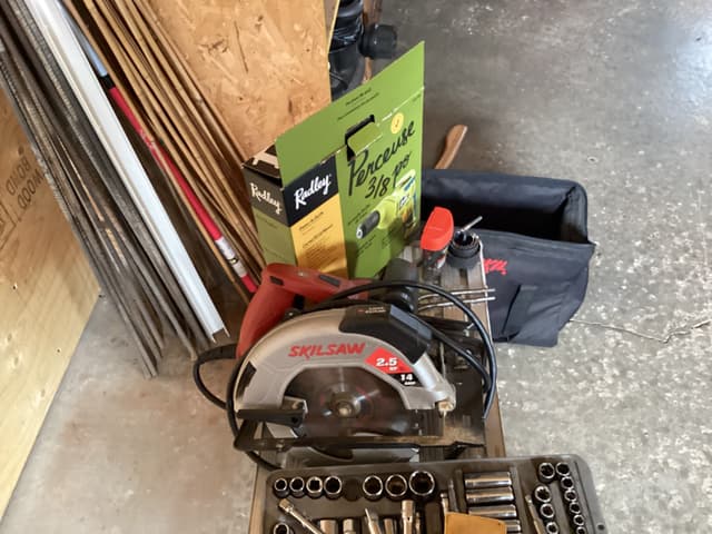 Skill saw with kit 85.00, electric drill with several bits 45.00, compressor with small tools 135.00, palm sander 10.00, 8 foot extension ladder 50.00, miscellaneous brick laying tools in box 15.00, complete set of ratchets with all sockets 85.00 plus miscellaneous other tools for sale