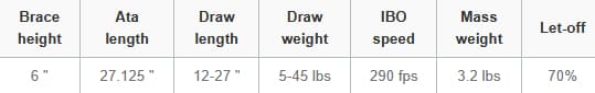 Black Left Handed Bar Cruzer. Brace Height = 6" Ata length = 27.125" Draw length 12-27" IBO speed = 290 fps Mass Weight = 3.2 lbs Letoff = 70%