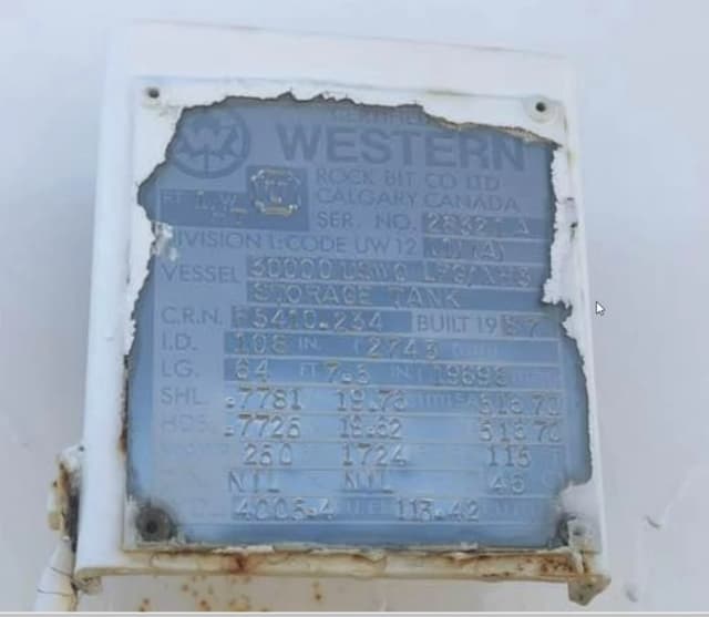 1987 Western Rock Bit 30,000 gallon NH3 Storage Stress relieved Welded Saddles CRN # .234 108” Diameter 65’ OAL Head & Shell Material SA516-70