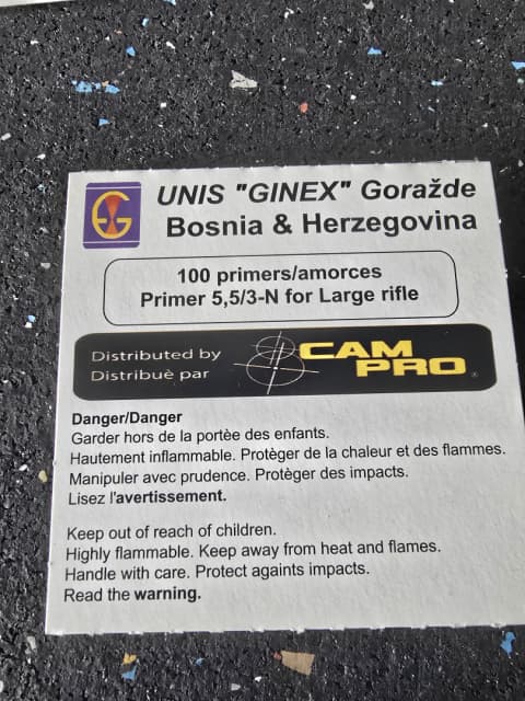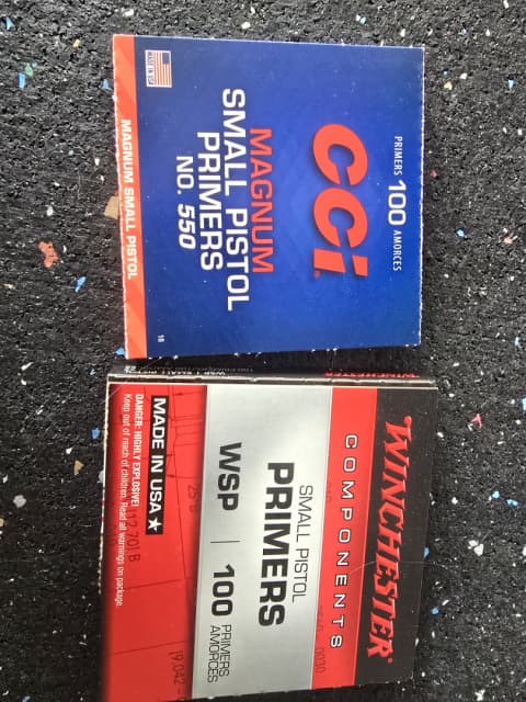 Large rifle, Cam pro ginex made in bosnia $25 per 100, 8 available. Large rifle, fiocchi made in Italy, $35 for 150, 9 available. Small pistol magnums, cci no. 550, $13 per 100, 5 available Small pistol, winchester wipe, $13 per 100, 5 available.