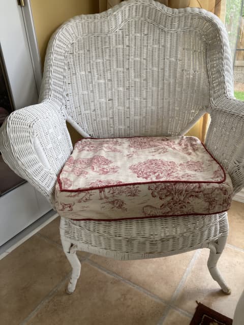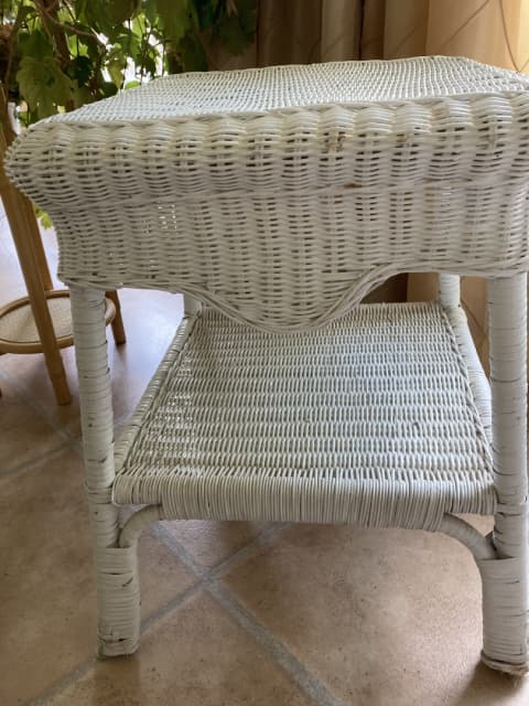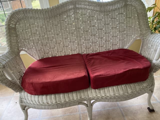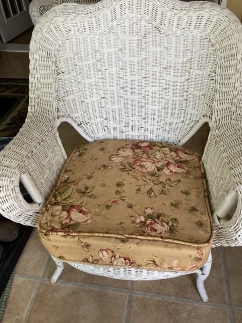 White wicker furniture in good condition for sale. Set includes 2 chairs, love seat and end table. Cushions included.