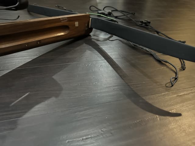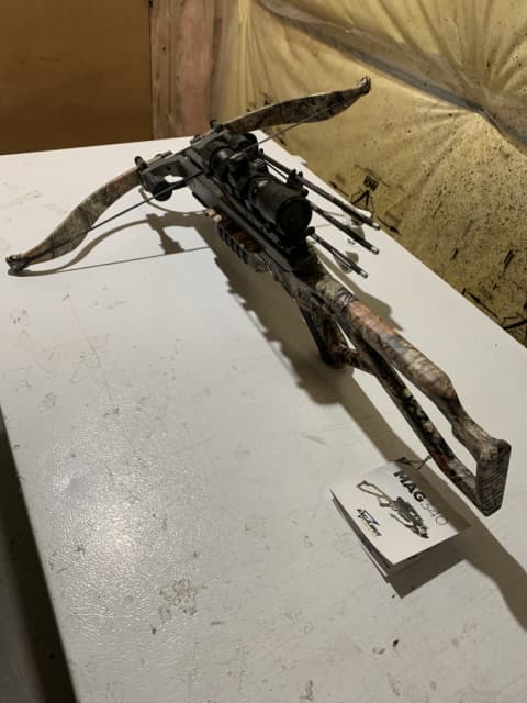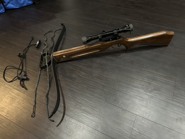 Wooden recurve crossbow, two strings, cocking aid , Tasco scope with clear optics & lens covers.