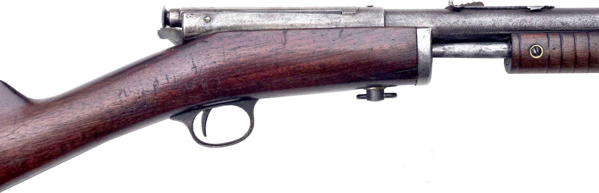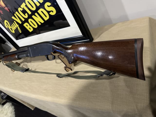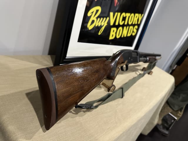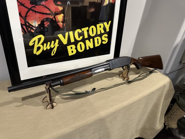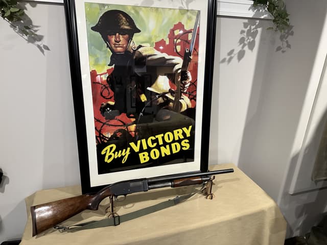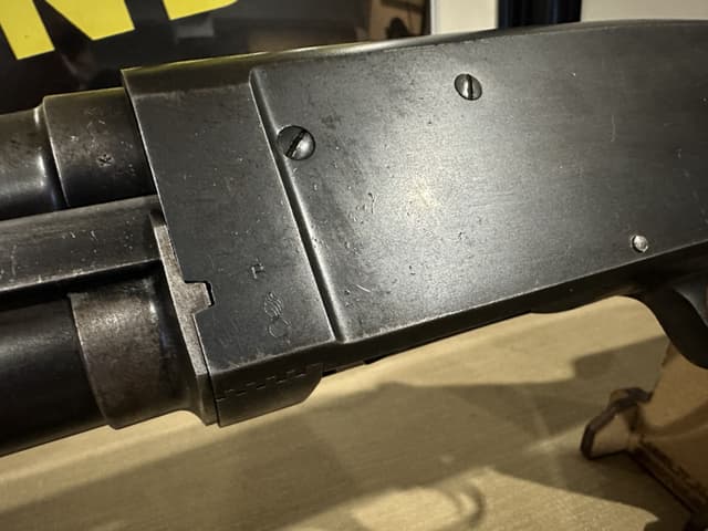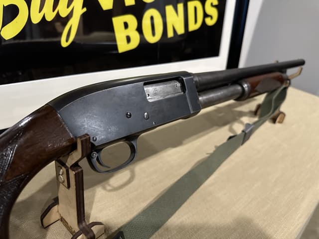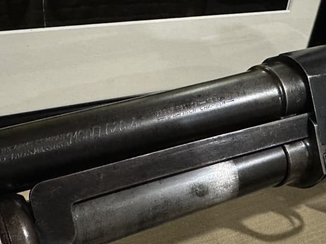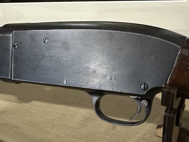 This Shotgun stamped twice with US Flaming Bombs with letter P proof mark, possibly a training shotgun, serial number outside of estimated range of Riot guns. Brass bead, blued finish, round barrel. Two piece wood stocks, takedown model with checkered forearm and pistol grip, brown rubber recoil pad, also comes with M1 combat sling. Wear: Metal finish shows some scratches, handling marks and wear. Stocks show some marks, scratches and wear. Make:STEVENS US MILITARY Model: 620-A Caliber: 12 G X 2 3/4" | Choke(s): Fixed Cylinder Choke Bore(s): Excellent Can ship anywhere in Canada, Please see my other ads for rare and collectible, firearms and accessories.