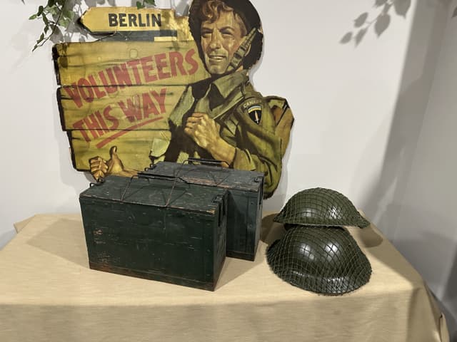 WW2 1945 Dated Wooden Ammo box’s & Helmets