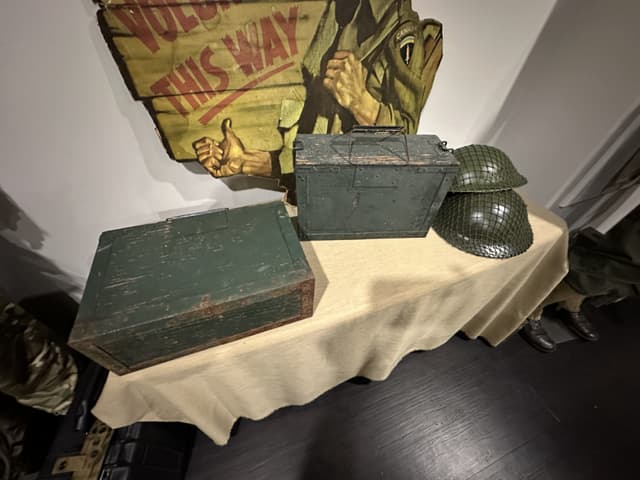 Here you own a piece of history both of these wooden ammo cans are date stamp 1945. $120each each have a little bit of rust on the bottom, which could be cleaned up nice. For the helmets, there is one that is marked CL/C 1942 and another one is marked GSW 1941. $250 for each one and very good clean condition. Please see my other ads for rare and collectable World War II items. Can ship anywhere,