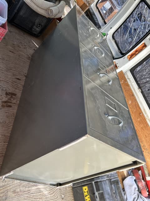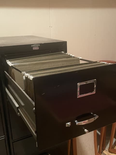 Four drawer legal size metal upright filing cabinet c/w hanging file holders. Good condition.