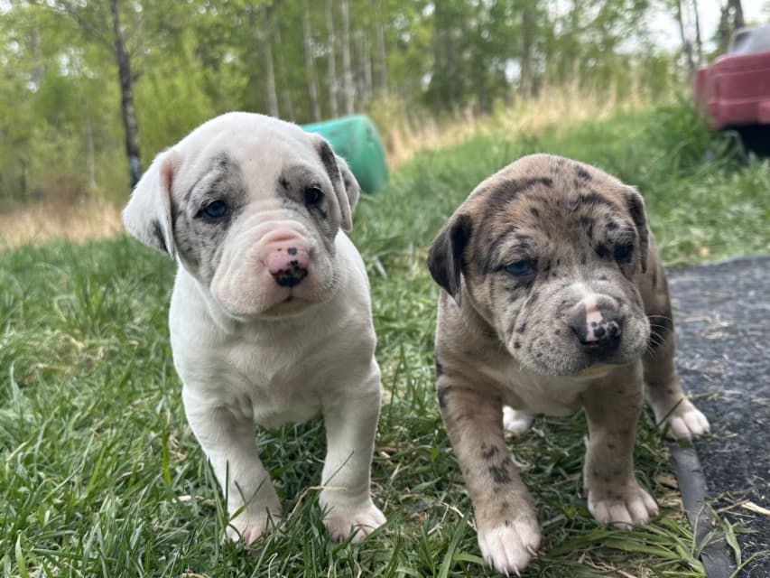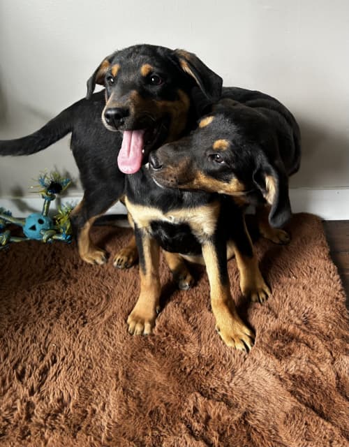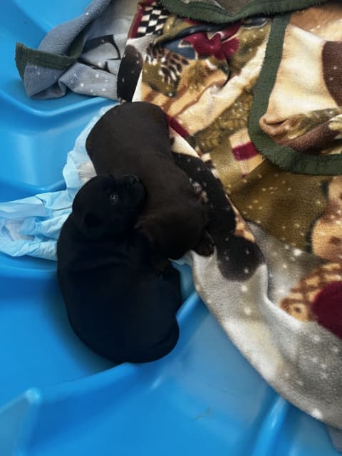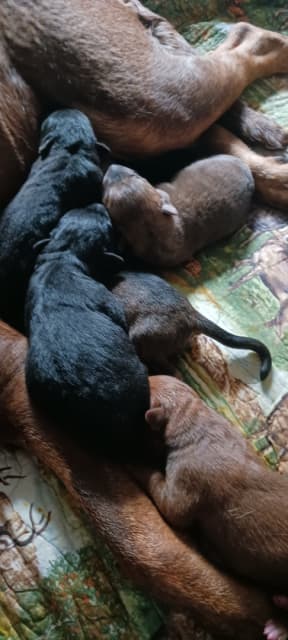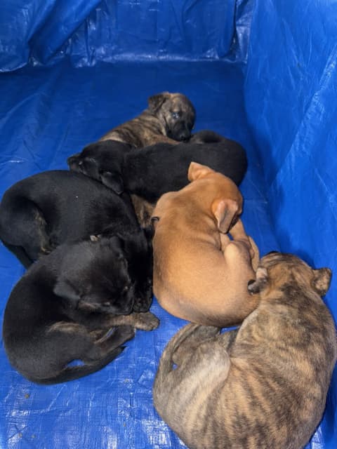 4M 2F puppies coming into the 5th week of age. Growing beautifully:) and healthy ✨️ 2 are brindel. 1 is dark tan 3black with coloring like momma(mix of chocolate and caramel browns) . Chocolate Lab and Black Mouth Cur mix/breed. Med-large size They R sincerely soooo cuteee and adorable theyre Playful and have been held and played with by toddlers-adults.