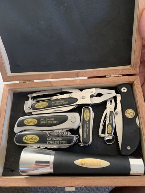 Boxed Set of 6 Knives and Flashlight, in a Cherry-Wood Keepsake Box. These knives are very high quality and some are similar to multi-tool knives. This set has never been used, individually or as a group and some of the 6 knives separately sell for over $35.00.