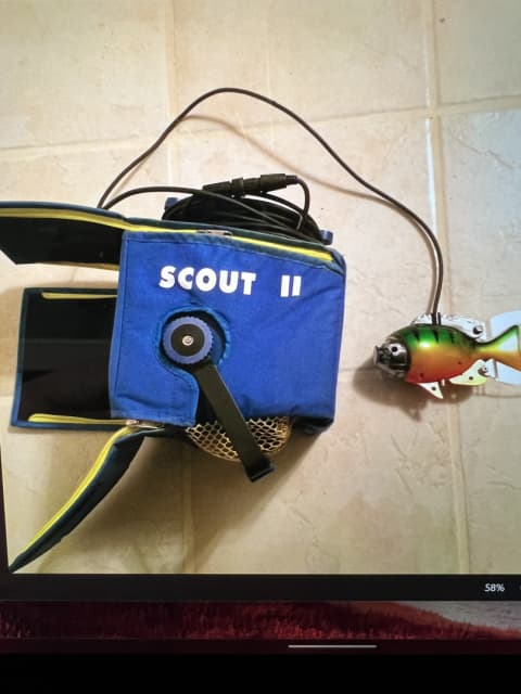 Aqua-view scout 2 underwater camera for ice fishing, black and white 3” screen. Comes with 12 volt battery.