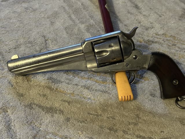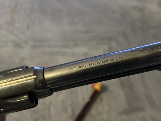 Very rare Remington model 1875 SAA in 44 Remington caliber. This revolver still retains about 75% of the original nickel two piece wood grips show typical ware but no chips or cracks. The action is very crisp and functions correctly with excellent timing and lock up., the bore shows typical black powder pitting, but lots of strong visible rifling This is an antique and you do not require a PAL to purchase this firearm. RCMP, FRT document included.