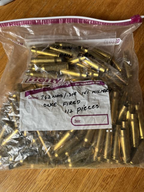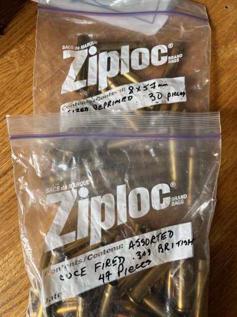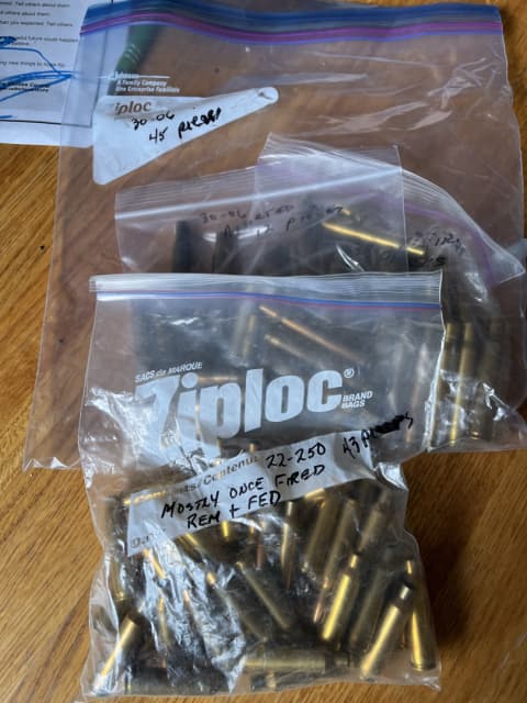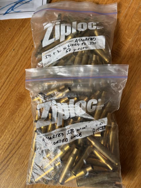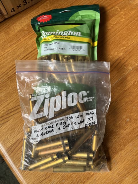 - 223 Rem 50 pieces, loaded once $20 - 223/5.56 NATO 180 pieces, once fired, resized, deprimed $50 - Both of the above $60 - 22-250 mixed Rem and Fed, mostly once fired, 43 pieces $20 - 270 Win and 30-06 sized to .270, 50 pieces $15 - 270 Win assorted head stamps, reloaded once, 68 pieces $25 - All 270 $35 - 30-06 once fired, mostly Win, 45 pieces $20 - 308 Win, once fired, 20 pieces, $10 - .308 Win/7.62 NATO, IVI Head Stamp, once fired, 112 pieces, $30 - All .308 $35 - .300 Win Mag by Rem. New in bag, 50 pieces, $40 - .300 Win Mag, assorted, once fired including 16 NORMA, 37 pieces, $30 - All .300 Win Mag, $60 SOLD - .303 British, mostly once fired, Imperial Head Stamp, 47 pieces $20 SOLD - 8x57 Mauser, once fired, resized, deprimed, 30 pieces, $15 - All plus shipping if necessary