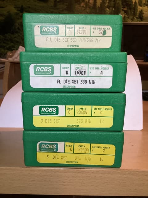 RSBS Reloading Dies - 338 win - 358 win - 375 Win . All are next to new. One 375 win is unused. $ 30 for the 338 win and 358 win. $ 40 for the 375 win.