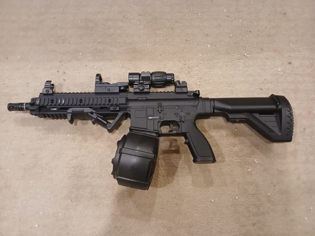 I have a gelsoft gun (not airsoft), that shoots 7-8mm gel orbeeze balls. The top 2 sights are decorative more than functional. Comes with a drum mag, foregrip, iron sights and a battery. Gelsoft is great for indoor shooting as it doesnt damage your home & the ammo is cheap. Asking $100, please text @ 780-699-9507