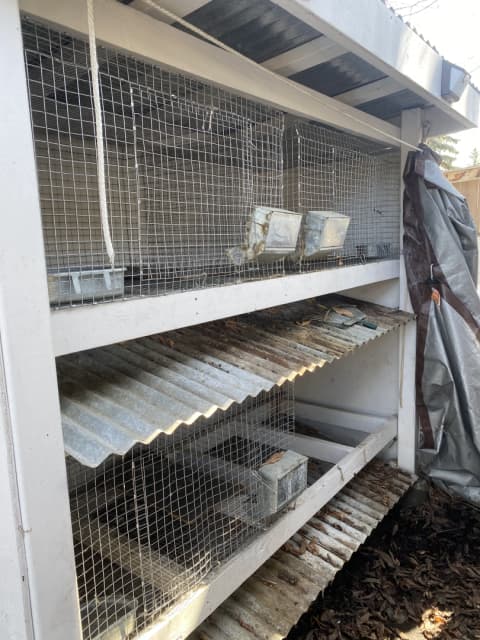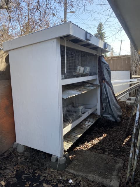 Hand made, painted, with tin roof, tarp, rabbit cages/ feeders/ bowels/ had solar lights as well all enclosed. Will disassemble for you just load it up.