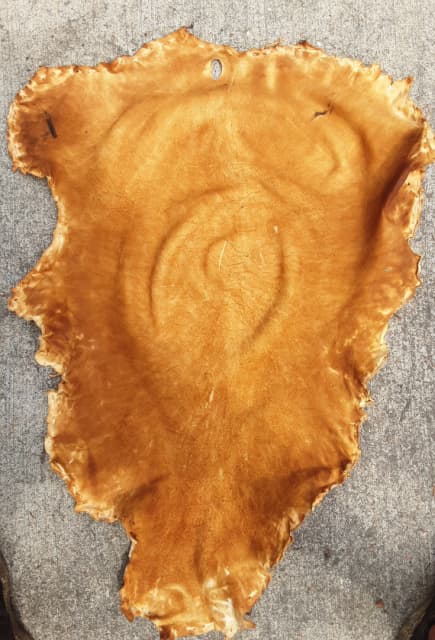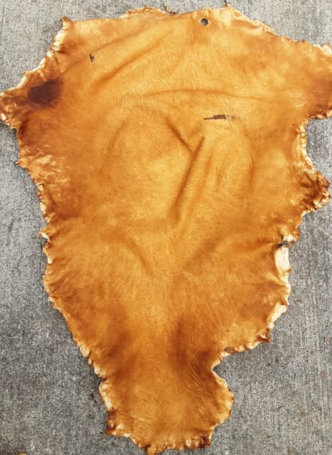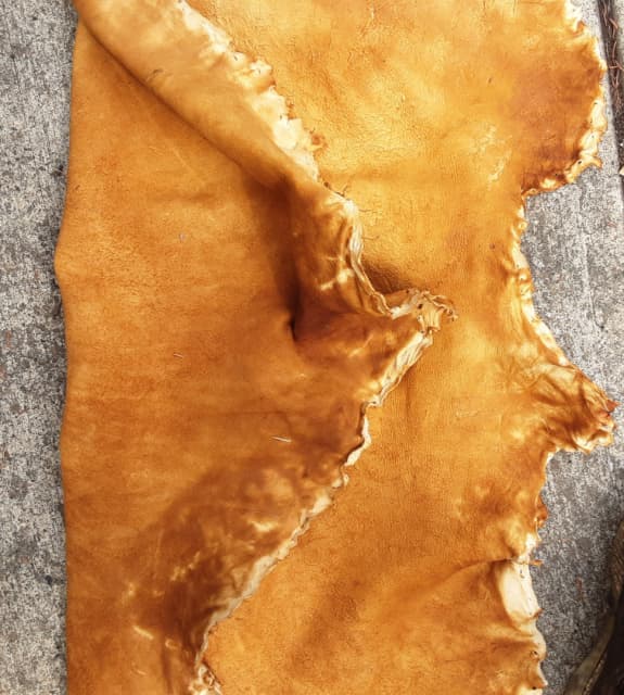 Soft, stretchy, rugged. Self-made, noncaustic softening solution to soften (no brain matter), then it is smoked with wood. The material is fully biodegradable and nontoxic - bush live-in's. Buckskin is easy to stitch, sew, and to manufacture articles by people with no experience (all you need is a knife, and awl). With little care, outdoor gear made from it will last years of tree wrestling. Clothing from buckskin will not have a zip sound when rubbing trees; poking insults will never snag and tear, and the materirial fully sheilds from all biting bugs. Resists hot fire sparks, unlike tough plastic weave. Sleeves and pant legs will put the terrifying edge on your tools after the hone when used as a strop. Ideal for the forestry industry polluters (surveying with the pvc-plastic ribbon they leave to degraded all-over the Alberta woods), photographers, hunters, or all other bushworkers. Also an option for moms that want nontoxic, fire-retardant-free fabric for their kids. If you need bush rugged, id bet everything, any day, on a pair of leggins over any Mossy Oak rubish. Creep ability? Never had an issue with smells developing if dried well or with camouflaging into brush. 43" longest/31" at the widest point. 2.5/5 dense Black smears Generously priced. price is firm - shipped, made for Canadian outdoors. Show less