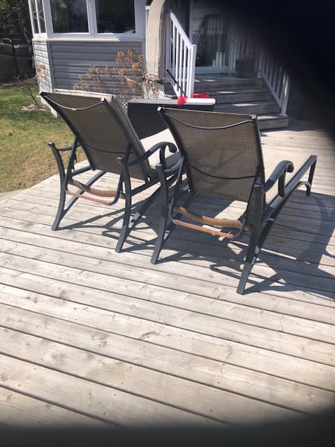 SOLID wrought iron Chaise loungers with woven weather resitant seating -weather resistant cushions included -original purchase price 750.00 per chair without cushion selling Pair with cushions for $250.00 cash only upon pickup please