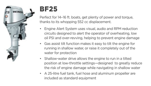 25 horsepower outboard motor. Perfect for 14-16 foot boats. Features an engine alert system, gas assist tilt function, and shallow-water drive. My loss, your gain! Save nearly $3500.Used 3 times.