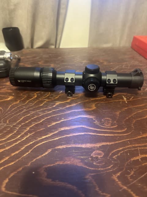 Vortex strike eagle 1-6x24 illuminated lpvo. Come with rings and objective cap. Has a couple marks from use that are pictured but is still in excellent shape, was mounted on a chicken gun. Glass and operation of the turrets all work as they should. Try your trades