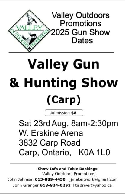 The H.M.C.S. Ancaster/Hamilton Gun & Militaria Show Ancaster Fairgrounds Marritt Hall 630 Trinity Rd South Jerseyville, On SUNDAYS: 14 December 8 am - 1 pm $5 Admission Ample Parking/Canteen on site For Show info call Marshall 289-700-6017