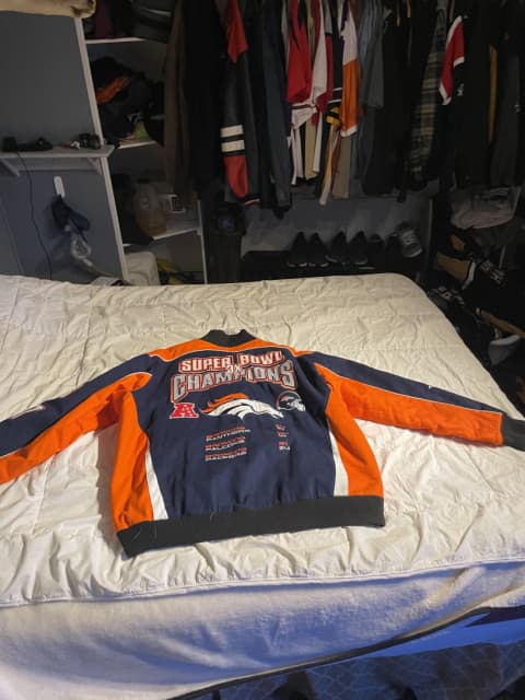If you’re a Broncos fan this is a must have jacket. This lined twill jacket 4xl, fits like 3xl. Never worn, brand new flashy jacket that no one else is wearing one!! I have a Baltimore Ravens and a Seattle Seahawks jacket and that I have been wearing for over five years and they still look fantastic!! Please check out my other adds, you may desperately need something else ! 😎