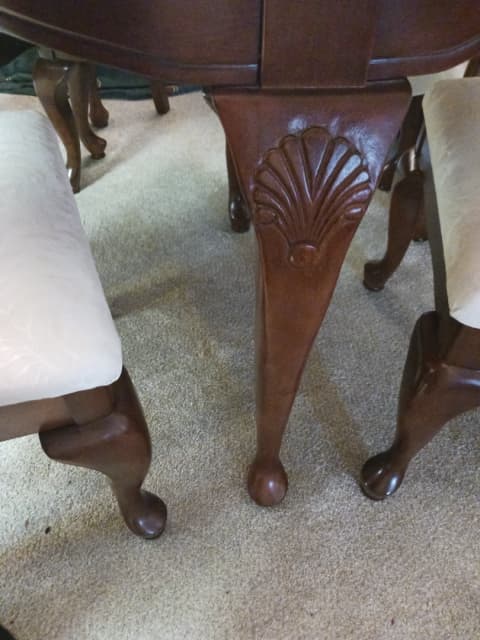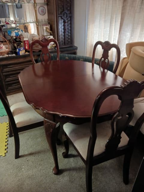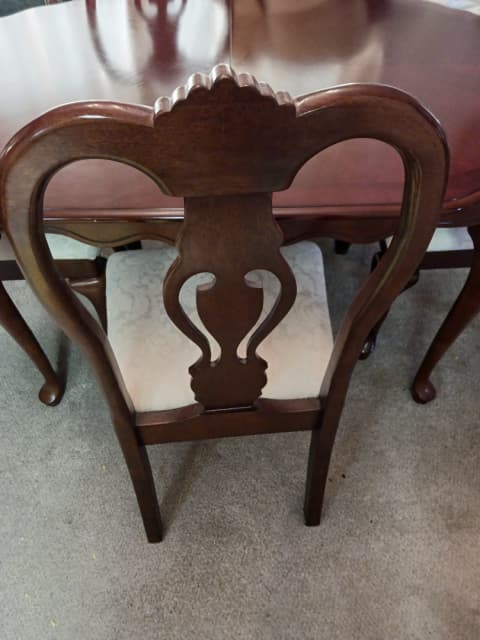 Great condition Queen Anne table with centre leaf and six chairs. White fabric and Cherry Wood with Scallop embellishments. Pick up in Heffley Creek.