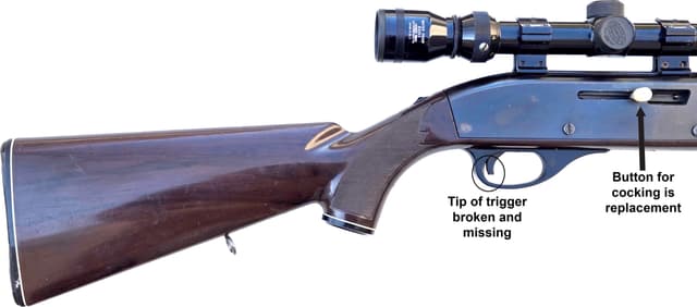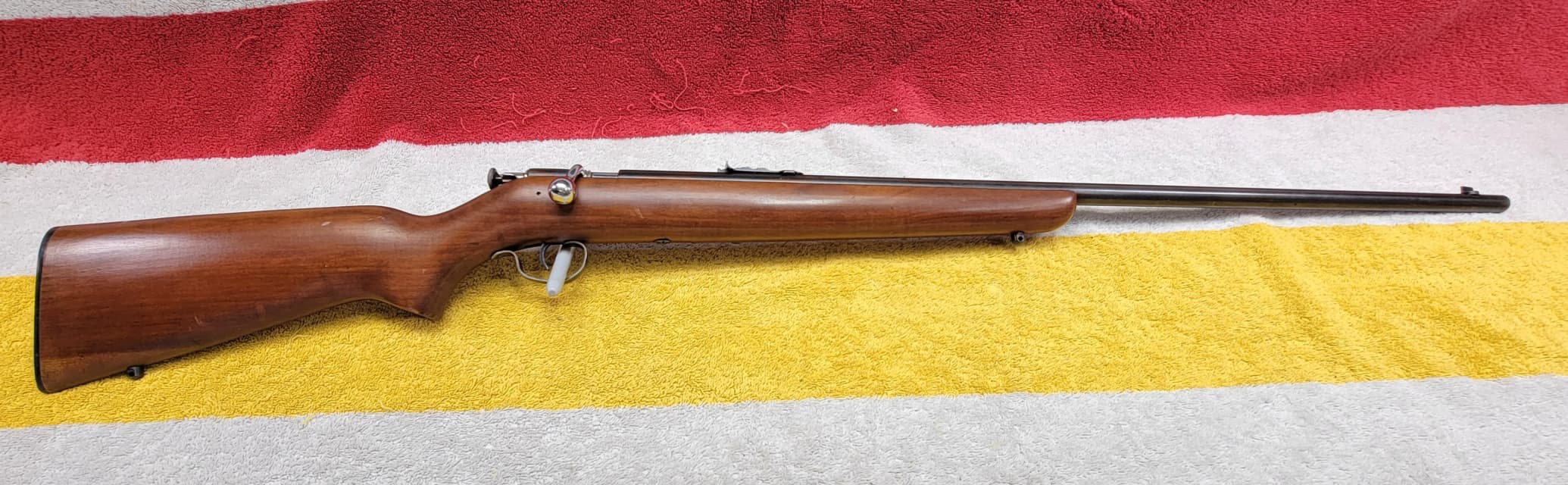 Condition: Very Good Condition with a few visible faults. The button to release the action is a plastic replacement. The tip of the trigger, about ¼ of an inch, has been broken and is missing. Otherwise, the blue on the barrel and action is about 80%. The stock and forend has several small scratches. The rifling is nice. I never tried it but looks in nice operating condition.