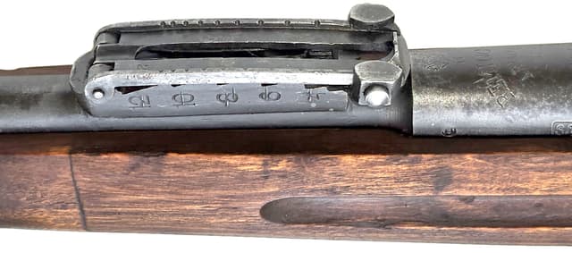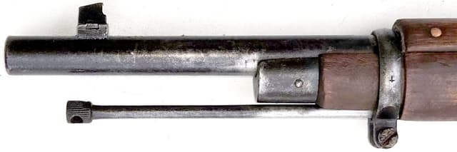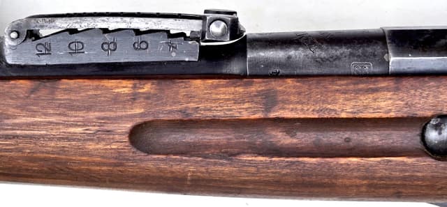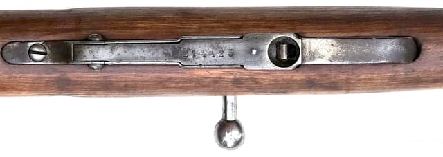 Condition: Very good. The blue on barrel and action is over 50%. The bore is very nice. The wood has several scratches having being used during the war. Serial number matches on barrel and bolt. The magazine cover has a different number. There is no serial number on the action and the butt plate. It operates correctly. Overall, this is a nice condition for such a rare rifle.