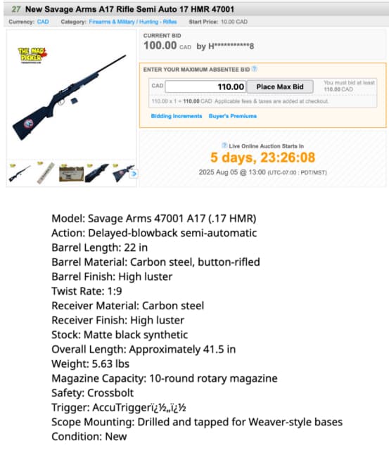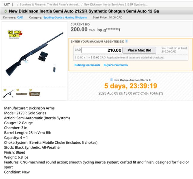 Take advantage of a chance to bid on BRAND NEW firearms! There’s also ammunition, gun accessories, hunting equipment, and other outdoor gear! Check the auction link below to view our items! Auction Link: https://bid.directauctions.com/Sunshine-Firearms-The-Mad-Picker-s-Annual-Gun-Auction_as109280 Pre-bidding is available now! Register for free. The highest bidder wins. You’re invited to view these lots yourself during our Auction Preview this Saturday, August 2nd at 27294 Fraser Hwy, Aldergrove, British Columbia, Canada. == Auction Details == Live Online Auction: Tue, August 5, 1:00pm In-person Auction Preview: Sat, August 2, 9:00am - 5:00pm Auction Preview Location: 27294 Fraser Hwy, Aldergrove, British Columbia, Canada Auction Pick-Up Days: Wed, August 6 to Fri, August 8, 9:00am - 5:00pm Auction Pick-Up Location: 27294 Fraser Hwy, Aldergrove, British Columbia, Canada Video calls & Facetime previews are available as well via appointment only. To book an appointment please email us at auction@directliquidation.ca with a time between 10am-5pm PDT. *** All firearm purchases require valid PAL. PAL must match the name on the invoice of the bidder's account. Buyers will be required to send a photo of PAL for verification. The guns are brand new. It may have been on display but has not been used. PLEASE EMAIL YOUR VALID PAL LICENSE TO themadpicker@directauctions.ca if purchasing firearms or ammunition. Shipping available for all items and will be billed to the bidder. Shipping for firearms will only be available in Canada. Valid credit card required for purchase. Thank you for viewing this ad.