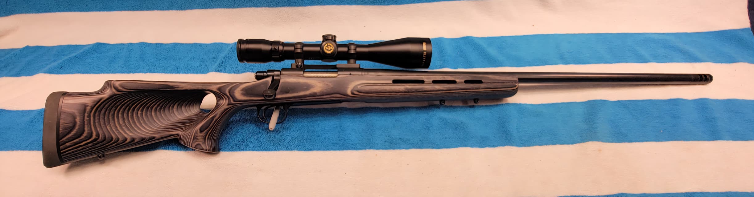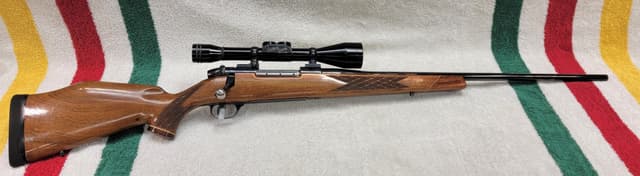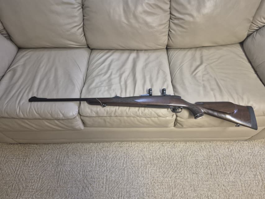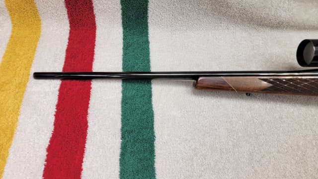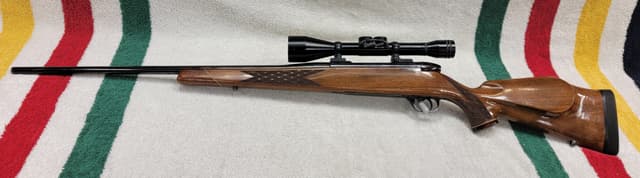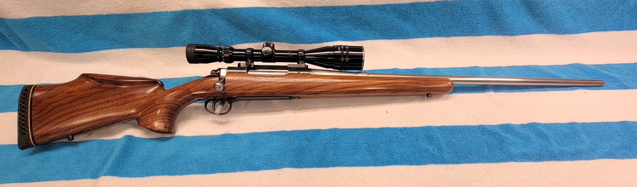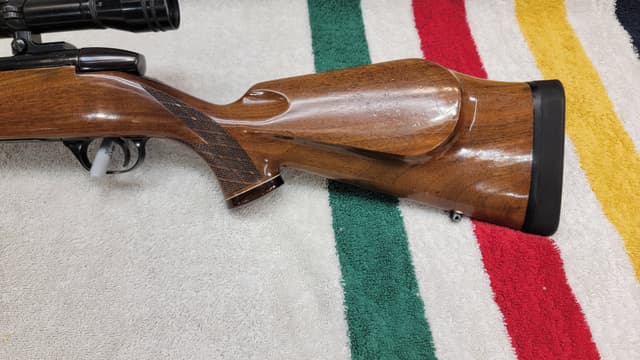 Weatherby Mark V in 300 Weatherby Mag. This one is one of the rare, Made in W. Germany rifles, and it wears an original Weatherby post scope 2¾x to 10x in Leupold bases. It is in very nice shape. The only flaw aside from a few bumps or light scraps is it appears to have been shot by someone wearing a beaver hat with flaps and metal clips. The raised comb has several small bumps on it, as seen in photos. From my point of view, love taps😀.
