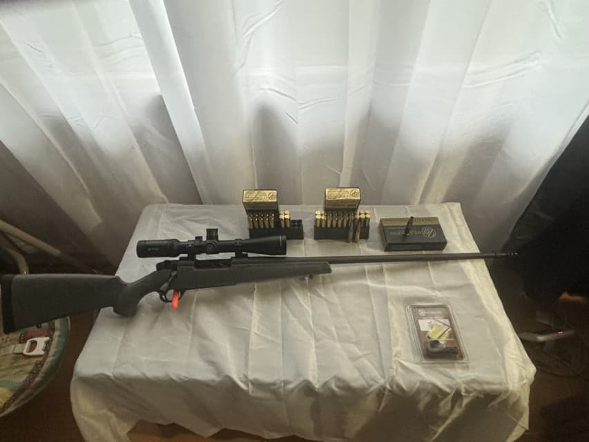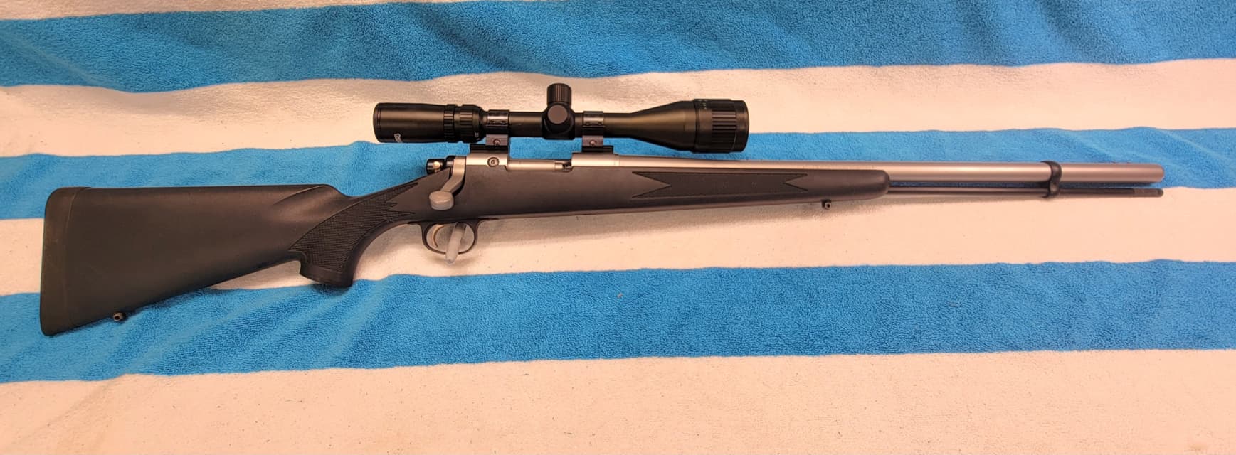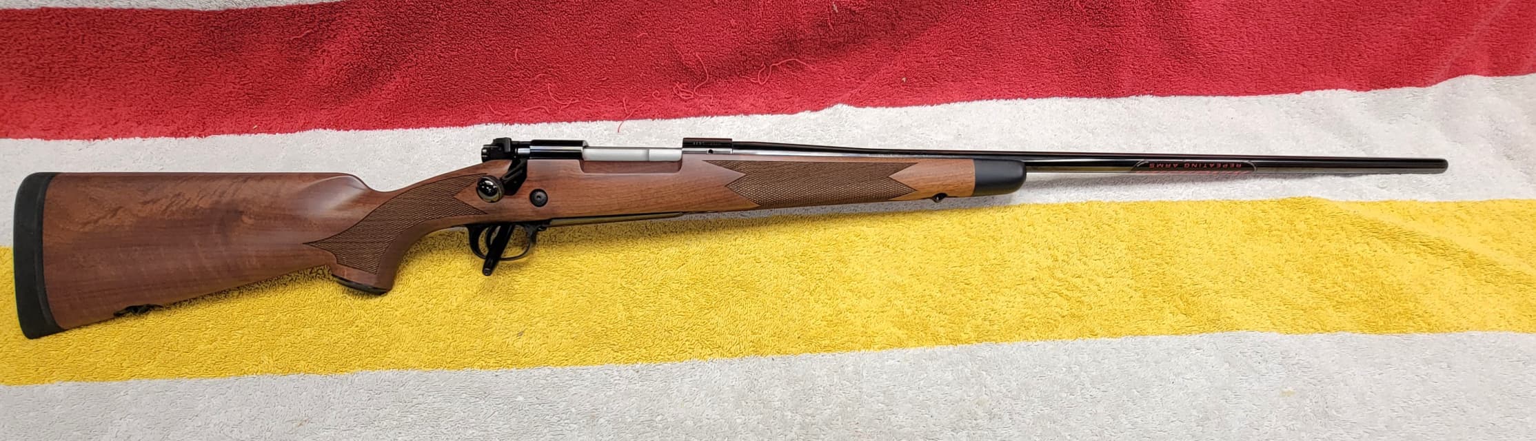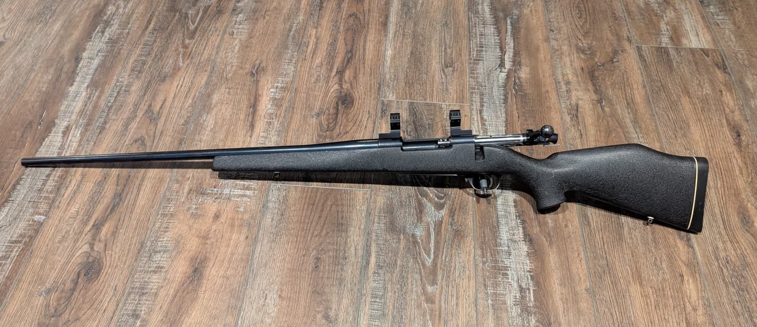 Weatherby Mark V in 300 Weatherby Mag. This one is one of the rare, Made in W. Germany rifles, and it wears an original Weatherby post scope 2¾x to 10x in Leupold bases. It is in very nice shape. The only flaw aside from a few bumps or light scraps is it appears to have been shot by someone wearing a beaver hat with flaps and metal clips. The raised comb has several small bumps on it, as seen in photos. From my point of view, love taps😀.