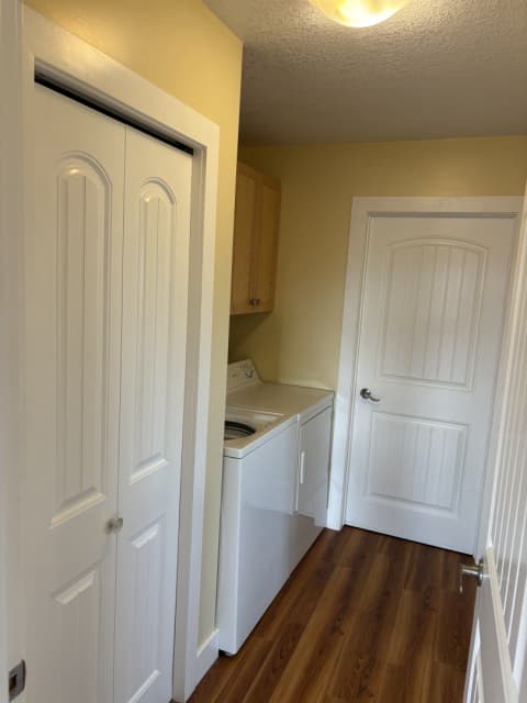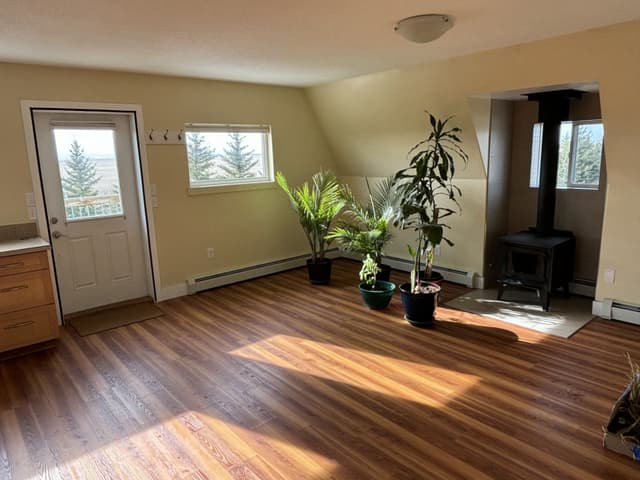 Combination apartment (700sq.ft.) and workshop (600sq.ft.) in quiet rural setting near Nanton. Ideal for a home-based business. Electricity and water included, but tenant is responsible for heating (propane). Apartment is one bedroom, one bath and has a wood-burning stove, fridge, washer/dryer. A lovely view of the mountains from the deck. The workshop has an overhead door, separate sink, separate toilet, compressed air, 220V power, heated floor. Situated NE of Nanton, this is a one year rental agreement. Parking for 2 vehicles. No smokers, and no pets. Available June 15th