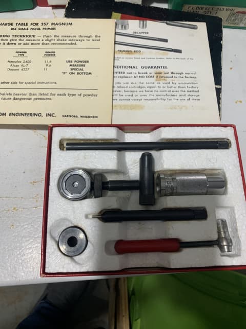 Vintage Lee loader .38/357 $100. Lee Loader 9mm Luger $50. Lyman .357 mag,rn,swc,wc,.357 maximum universal carbide set $125.RCBS FL die sets 7mm mag,.270win,30-06 sprg Will ship at buyers expense if necessary. All are in great shape. I also have brass and bullets for all if interested. I need a .223 rem die set if you want to trade 1 for 1.