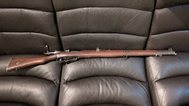 Lee Enfield No: 1 Mark III 1938 GR1 Singapore SMTLE . 303 BRITISH 10 round Mag, full wood, swivels, bayonet lug with pig sticker bayonet included, rear brass butt plate with tool kit compartment, 2000m rear adjustable iron sight. Frame and butt stock medallion match. Mag number unreadable. Length: SMLE No. 1 Mk III: 44.57 in (1,132 mm) Barrel length: SMLE No. 1 Mk III: 25.2 in (640 mm) In late 1915 the Mk III* was introduced incorporating several changes, the most prominent of which were the deletion of the magazine cut-off mechanism, which when engaged permits the feeding and extraction of single cartridges only while keeping the cartridges in the magazine in reserve, and the long-range volley sights. The windage adjustment of the rear sight was also dispensed with, and the cocking piece was changed from a round knob to a serrated slab. Rifles with some or all of these features present are found, as the changes were implemented at different times in different factories and as stocks of parts were depleted. The magazine cut-off was reinstated after the First World War ended, and not entirely dispensed with in manufacturing until 1933. The SMLE Mk III* (renamed Rifle No.1 Mk III* in 1926) saw extensive service throughout the Second World War, especially in the North African, Italian, Pacific and Burmese theatres in the hands of British and Commonwealth forces. Australia and India retained and manufactured the SMLE Mk III* as their standard rifle during the conflict, and the rifle remained in Australian military service through the Korean War, until it was replaced by the L1A1 SLR in the late 1950s.The Lithgow Small Arms Factory finally ceased production of the SMLE Mk III* in 1953.