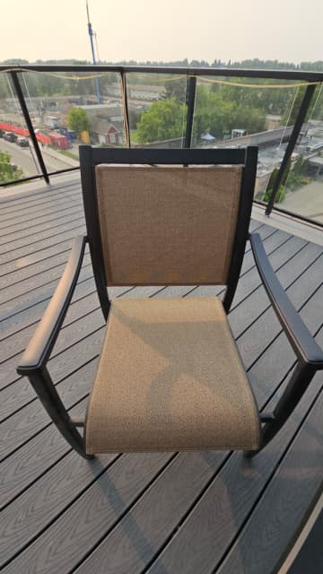 Home crest black powder coated dining table 62"x44" with taupe sling chairs.
