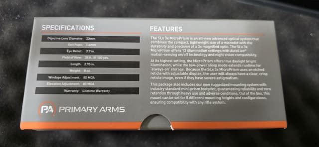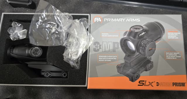 Brand new in box primary arms 3x micro prism scope optic is clear no dings or scratches