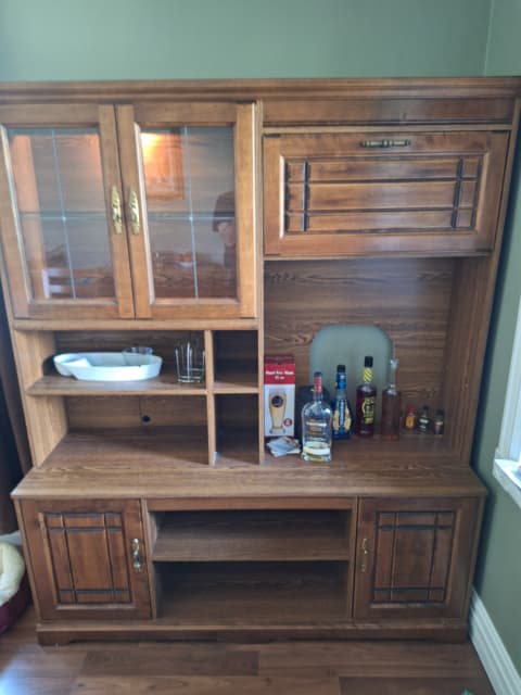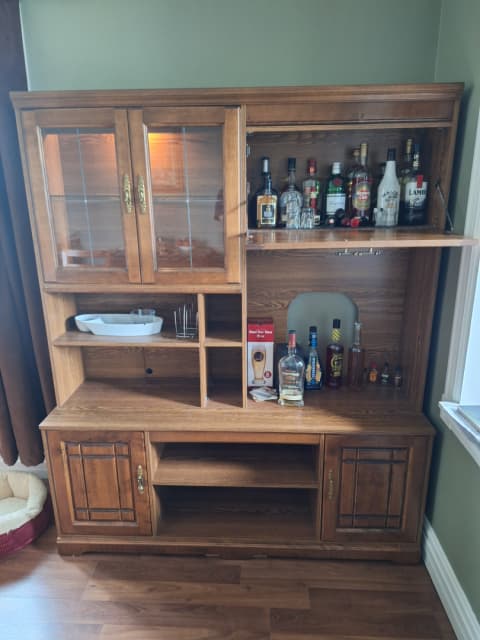 Entertainment / display cabinet available. 6'1" high, 5' wide. 18" deep. Will separate into two pieces for transport. Glass doors, glass shelves, accent lighting. (pick up only).