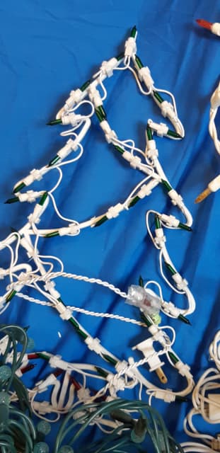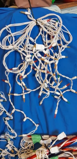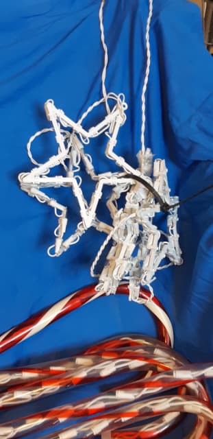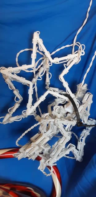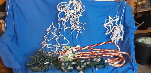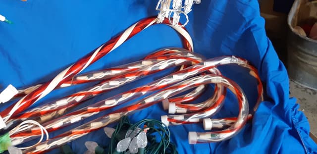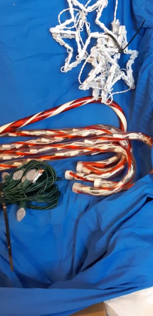6 candy canes 6x6 $36 1 16" Xmas tree wall/window decor. green/red $5 1 string icicles multicolored $5 1 string stars there's 5 - 8" $5 2 outdoor strings change color red/green $10 for both 3 indoor small, blue, ball strings $15 for 3 $60 for all