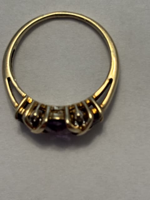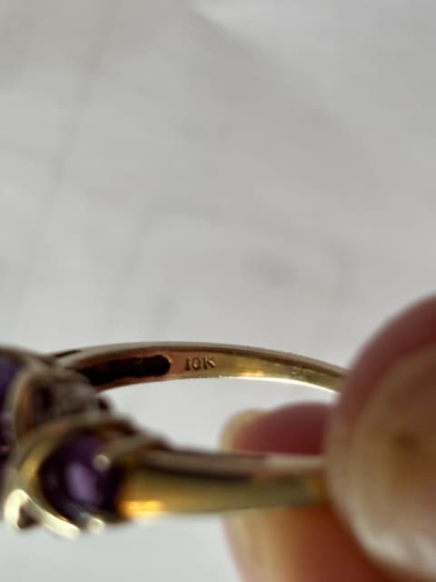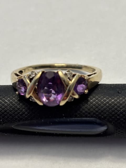 This is a 10 K gold ring with 3 Amethyst’s and 4 Diamonds. Ring is size 7.5 and in excellent condition, no loose stones. Text please. Buyer pays postage.