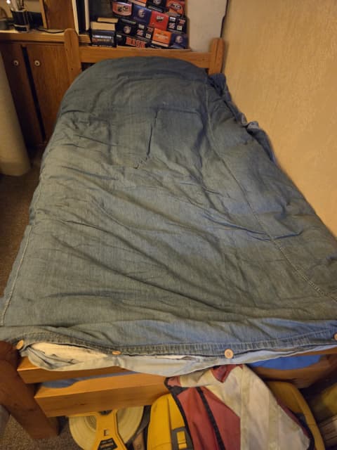 Solid wood kids bed. Comes with mattress,sheets and comforter.